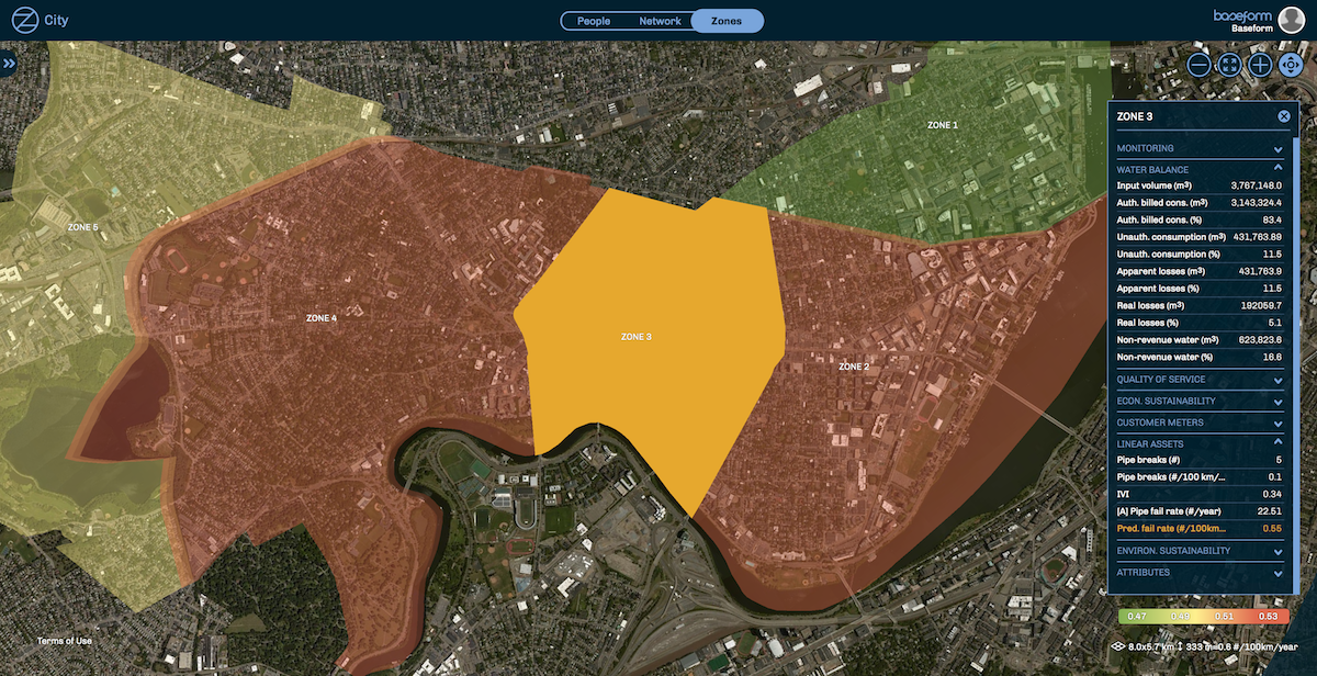 Baseform's automated validation, syncing and combination of the available sources of flow & volume data, including SCADA/telemetry, loggers, billing and customer meter data, enables our client utilities to add the Water Balance theme to the range of on-demand indicators permanently available on the 3D user interface.