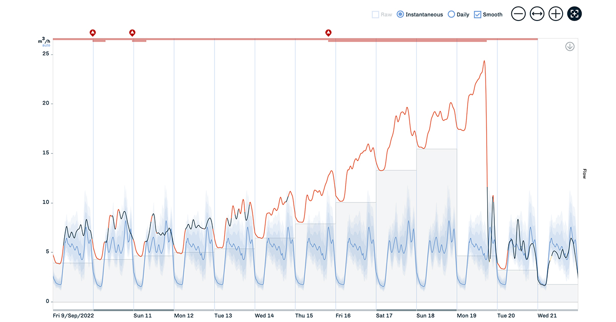 Here's another example of the many we see every week in our clients' radars - in this case a stealthy leak into a sewert which would have been on its way to a massive volume lost if it hadn't been caught in time. The software is never asleep and is a crucial resource to the utility in detecting and quantifying trends that may develop into full blown problems.