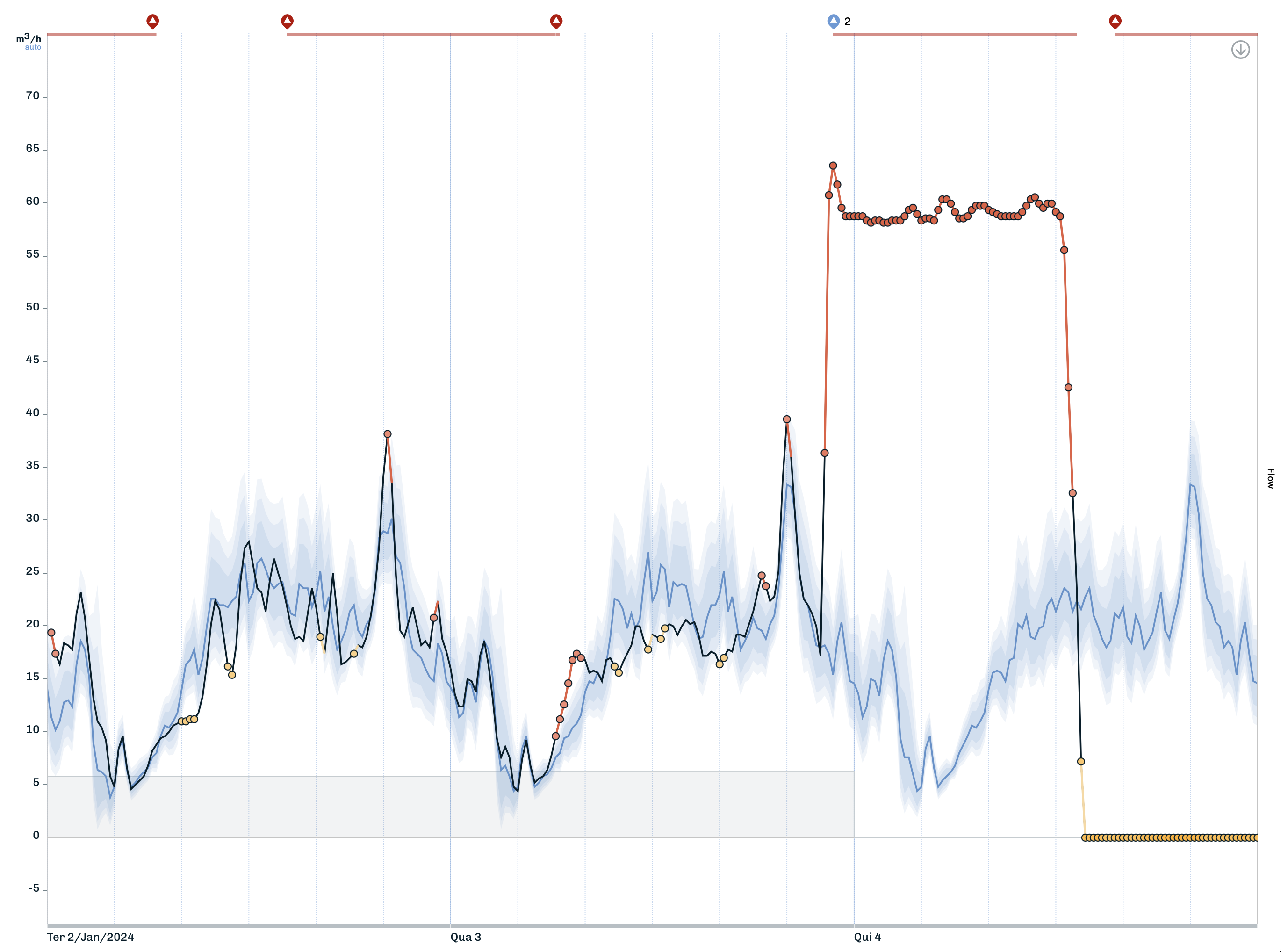 Few things are as useful to the efficient operation of a water system than flowmeter-equipped distribution sectors, also known as DMAs. They provide key quantification of consumption and losses, as well as the ability to detect and react to anomalous events that may interfere with the service. They are a great addition to the system and their output is so immediately useful that we tend to believe it at face value, and run with it. But stuff breaks and flowmeters are no exception: from incorrect setup (often from the outset), to communications, power supply, deterioration or inner mechanics issues. It may be immediately visible - or sometimes not so much, giving the appearance that the monitored values are accurate or obvious to interpret. The detected event shown in the figure was not the pipe break that it looked like, but a random meter glitch that forced it to be taken out. For that reason, it is essential (i) to always keep present the possibility of malfunction when looking at monitored values; and (ii) have your flowmeters checked on a regular basis – once a year, at least. Baseform clients that have meter-checking routines in place, such as SIMAS Oeiras Amadora, assure us that the savings generated by such regular checks vastly outweigh their cost.