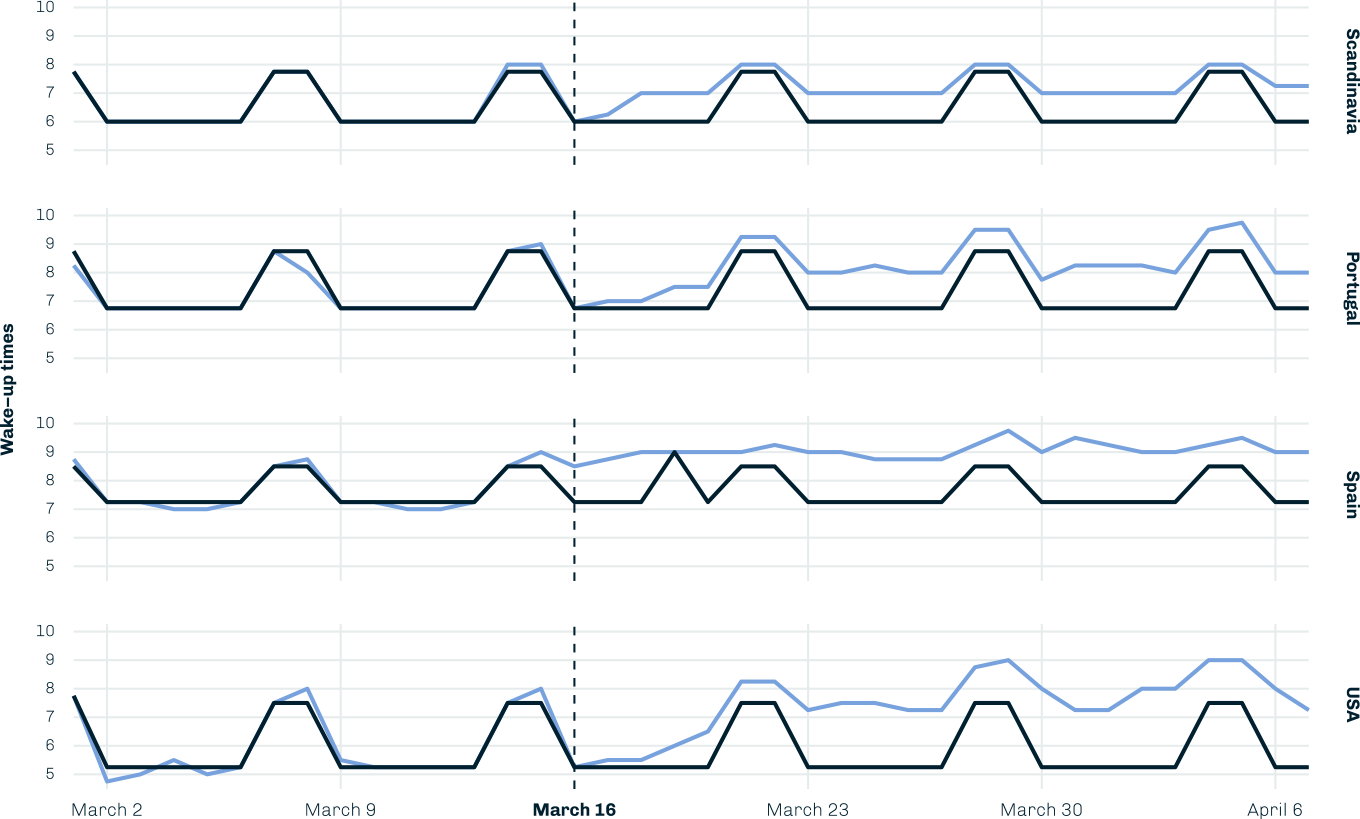 Wake-up times before (black) and after (blue) stay-at-home orders in four regions