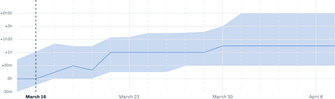 As we kept tracking this, what stands out is a continuous, steady increase in the change of behavior. On the first day data shows a +30 minute variation, which grows to +1h15 after three weeks, being as high as +2h30 in many areas.